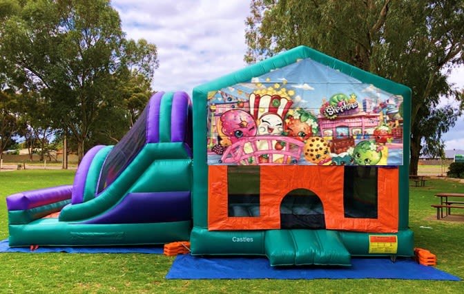 The Shopkins Large Bouncy Castle comes with a slide, a basketball hoop, a jumping area & steps to climb to the top of the slide. This inflatable/bouncy castle is ideal for kids in general up to the age of 18 years old.