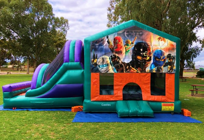 The Lego Ninjago Large Bouncy Castle comes with a slide, a basketball hoop, a jumping area & steps to climb to the top of the slide. This inflatable/bouncy castle is ideal for kids in general up to the age of 18 years old.