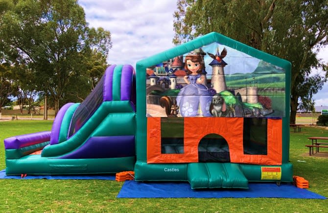 The Sofia The 1st Large Bouncy Castle comes with a slide, a basketball hoop, a jumping area & steps to climb to the top of the slide. This inflatable/bouncy castle is ideal for kids in general up to the age of 18 years old.
