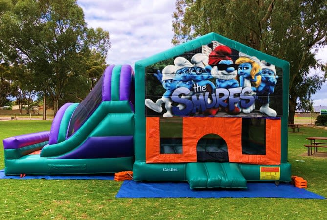 The Smurfs Large Bouncy Castle comes with a slide, a basketball hoop, a jumping area & steps to climb to the top of the slide. This inflatable/bouncy castle is ideal for kids in general up to the age of 18 years old.