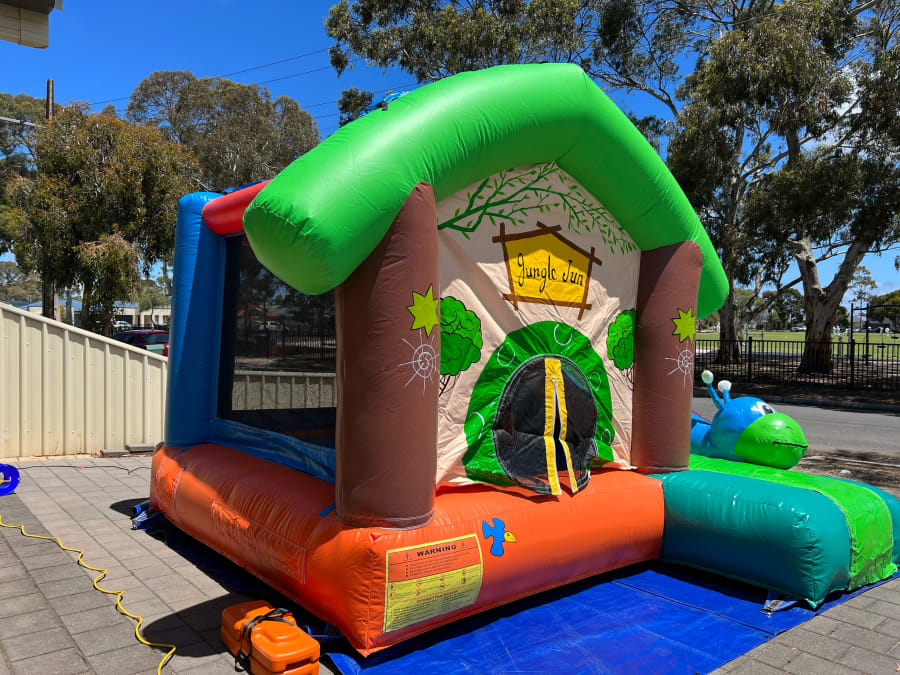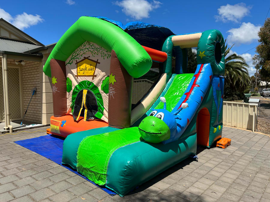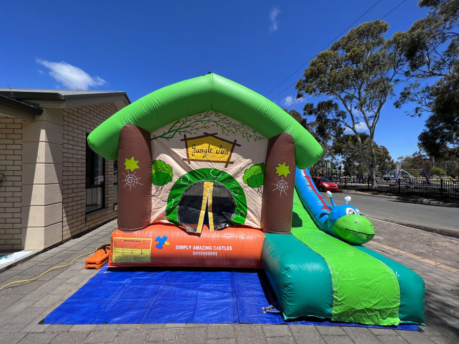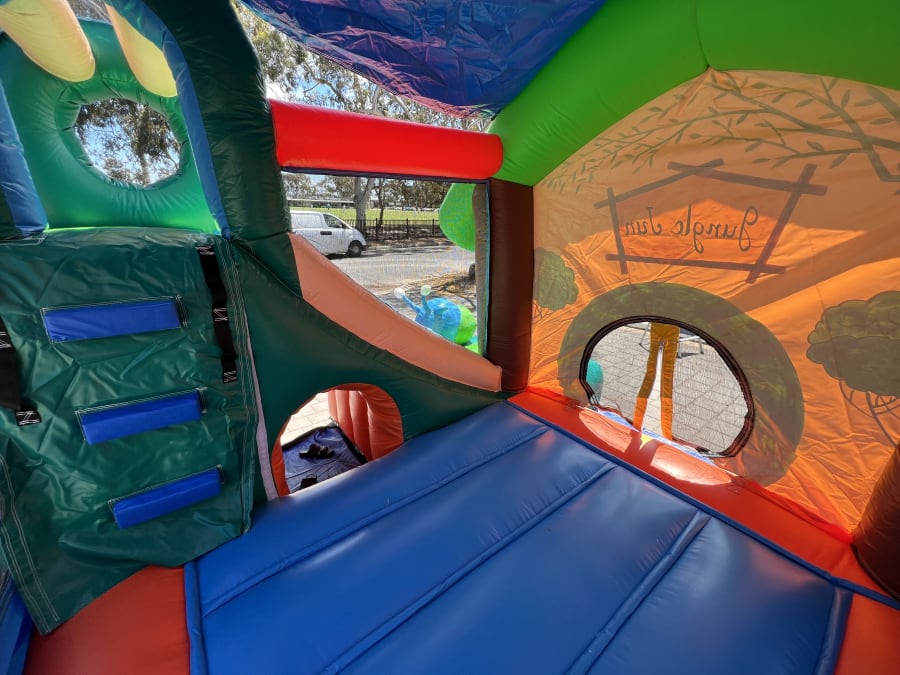 Any child who likes the jungle atmosphere and animals is sure to enjoy playing in this Jungle Fun Jumping Castle. It consists of a fun jumping area, steps, a cave entrance on the side which children will love to explore and a large slide outside that children will like to slide down again and again.