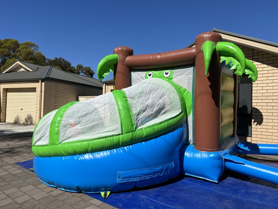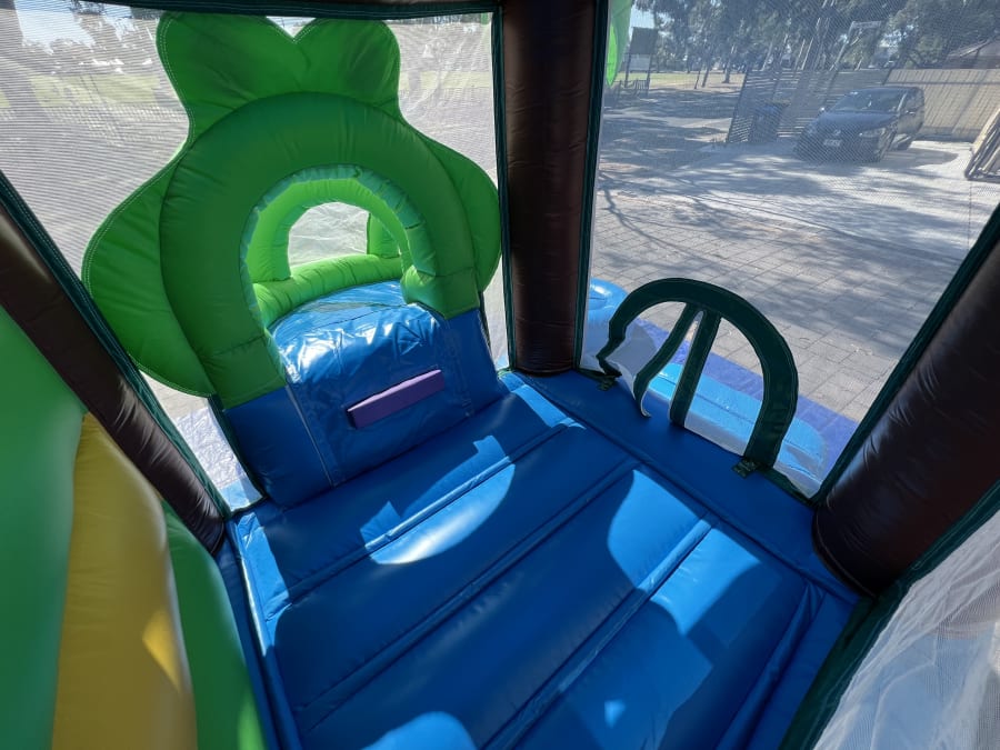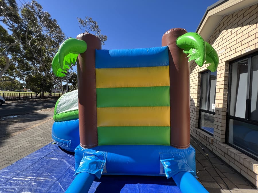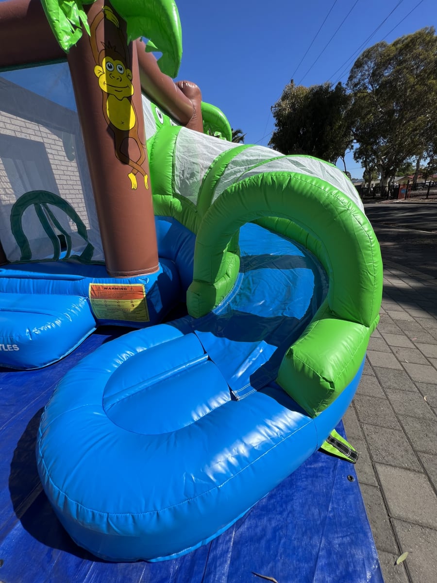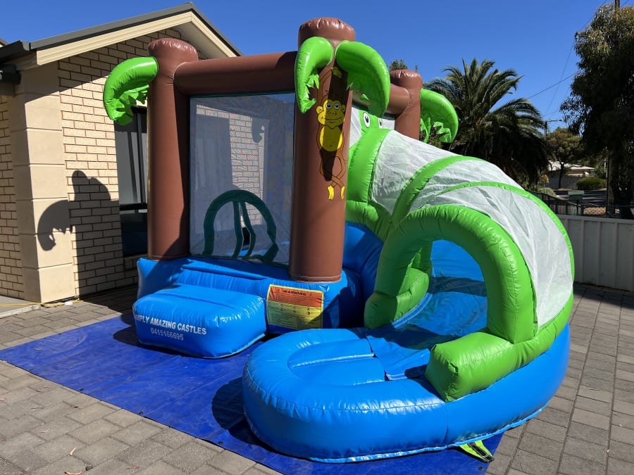 Any child who likes the jungle atmosphere and animals is sure to enjoy playing in this Mini Tropical Jumping Castle. It consists of a fun jumping area, steps and a large slide outside that curves around the jumping castle.
