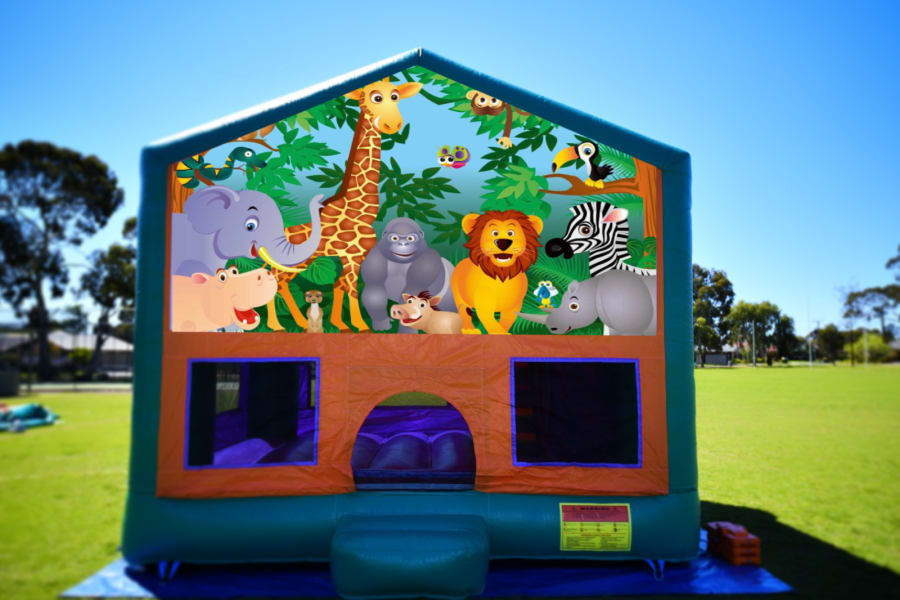 The Jungle Theme Medium Bouncy Castle comes with a slide, a basketball hoop, a jumping area & steps to climb to the top of the slide. This inflatable/bouncy castle is ideal for kids in general up to the age of 12 years old.